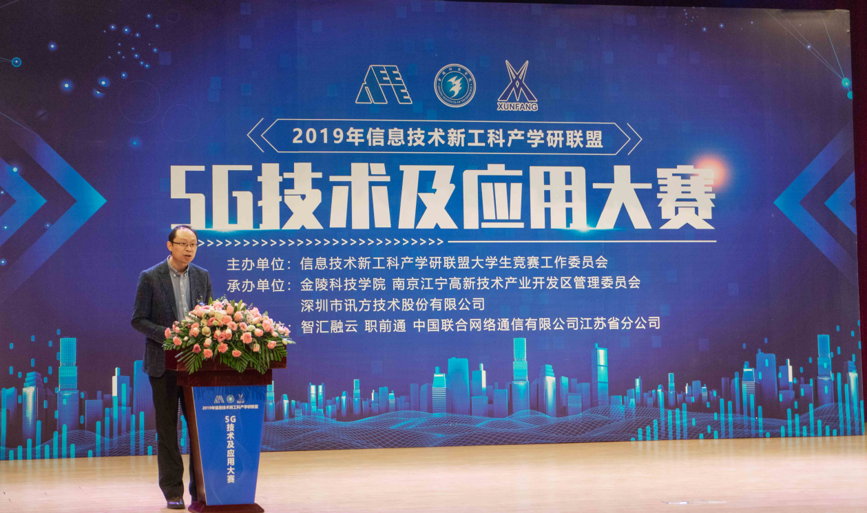 【中国,南京,2019年12月6日~8日】经信息技术新工科产学研联盟审批,由信息技术新工科产学研联盟大学生竞赛工作委员会主办,金陵科技学院和南京江宁高新技术产业开发区管理委员会、深圳市讯方技术股份有限公司联合承办,智汇融云信息技术(深圳)有限公司、深圳市职前通教育有限责任公司和中国联合网络通信有限公司江苏省分公司给予支持的2019年信息技术新工科产学研联盟“第一届全国大学生5G技术及应用大赛”在金陵科技学院隆重举行。金陵科技学院党委副书记、校长聂影教授,南京市江宁区人民政府副区长、江宁高新区党工委书记缪秀梅女士,金陵科技学院副校长张燕教授,东南大学孟桥教授,南京航空航天大学周建江教授,南京理工大学束锋教授,陆军工程大学蔡跃明教授,河海大学徐立中教授、国防科技大学南京校区梁涛教授,深圳市讯方技术股份有限公司戴毅董事长、刘国锋总裁、丁振强总工程师,中国联通南京市分公司刘涛副总经理出席了开幕式,来自全国的110个参赛队伍参加了开幕式。