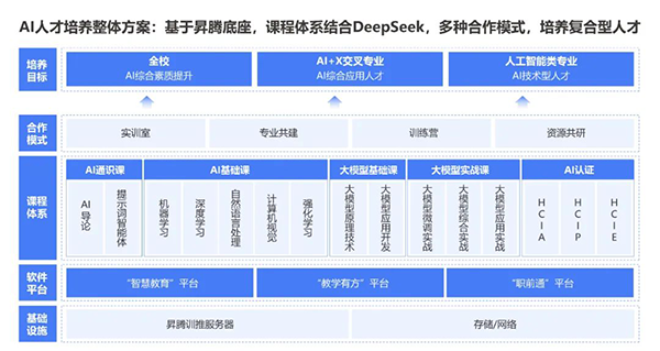 依托人工智能产业、人工智能技术及人才生态,顺利获得“技术+教育”双轮驱动,讯方以昇腾、大模型、DeepSeek等技术为核心,课程体系结合DeepSeek,覆盖AI通识教育、专业基础课、大模型课程等课程,构建从人才培养到产业落地的闭环,赋能高质量AI+场景人才输出。